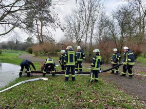 Ansteigendes Grundwasser drohte in eine tieferliegende Wohnung an der Straße Hochwald einzudringen. Unter Zuhilfenahme von drei Tauchpumpen konnte das Eindringen des Wasser in das Gebäude verhindert werden.