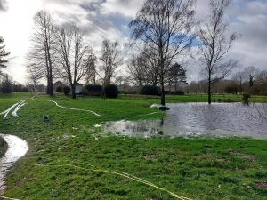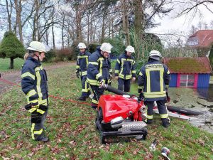 Parallel zu den Maßnahmen wurde ein angrenzender Gartenteich mit einer Tragkraftspritze abgepumpt, um weiteren Schaden durch aufsteigendes Wasser vorzubeugen.