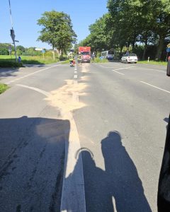 Ein geplatzter Motor an einem Bus sorgte für eine große Öllache auf der Antoniusstraße / Hoerstgener Straße.