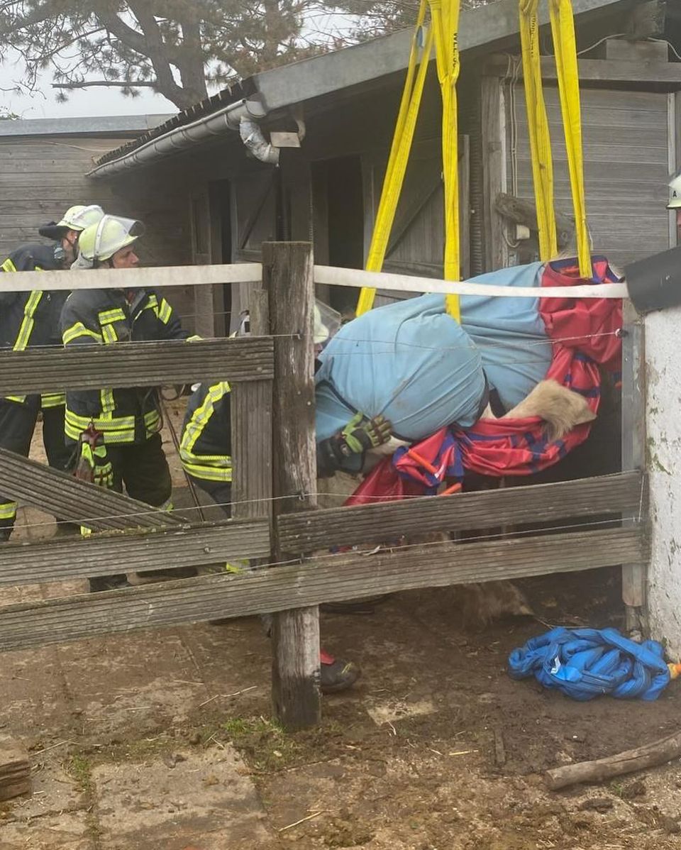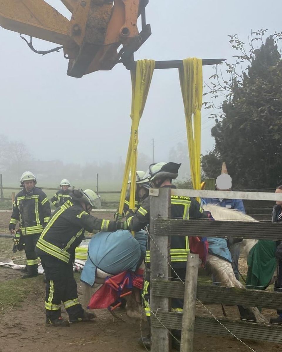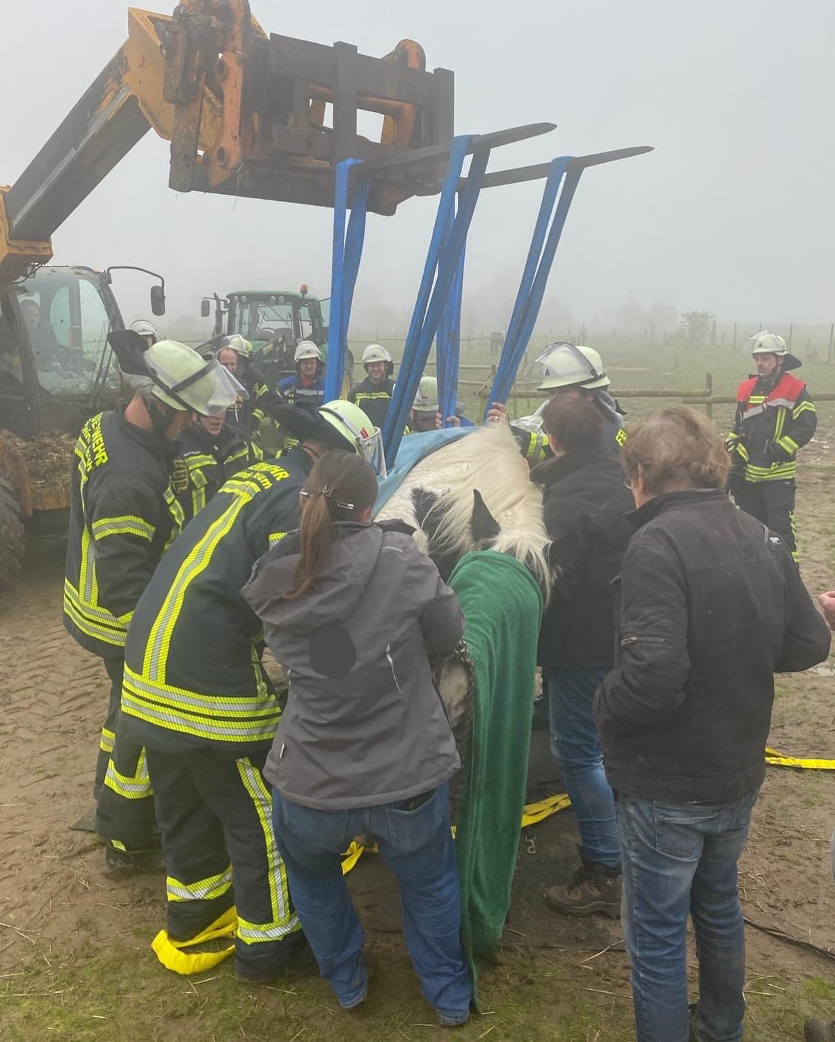 Da der Kreislauf des Pferdes immer schlechter wurde versorgte und stabilisierte ein Veterinär das Tier, bevor die Einsatzkräfte der Feuerwehr mit der Rettung beginnen konnten. Unter Verwendung mehrerer Tierrettungsschlingen und Zuhilfenahme eines Teleskopladers war das Pferd nach rund einer Stunde aus seiner Zwangslage befreit und wurde zur weiteren Behandlung in die Obhut des Tierarztes übergeben.
