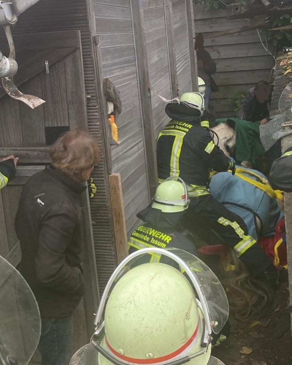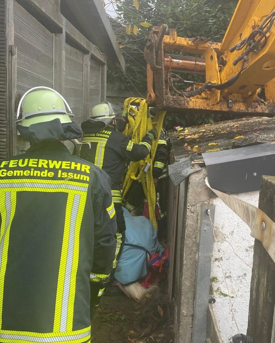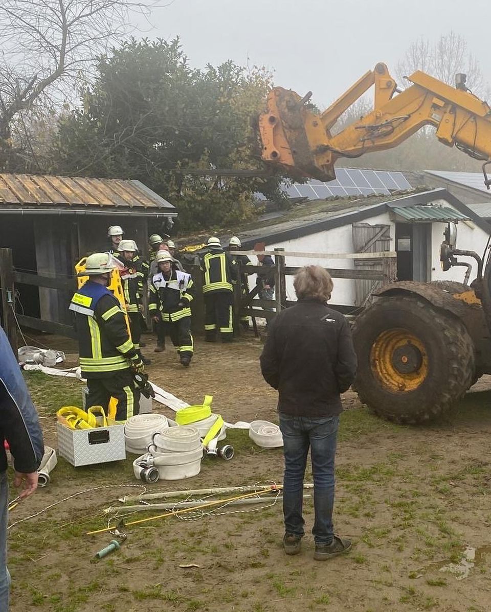 Da der Kreislauf des Pferdes immer schlechter wurde versorgte und stabilisierte ein Veterinär das Tier, bevor die Einsatzkräfte der Feuerwehr mit der Rettung beginnen konnten. Unter Verwendung mehrerer Tierrettungsschlingen und Zuhilfenahme eines Teleskopladers war das Pferd nach rund einer Stunde aus seiner Zwangslage befreit und wurde zur weiteren Behandlung in die Obhut des Tierarztes übergeben.