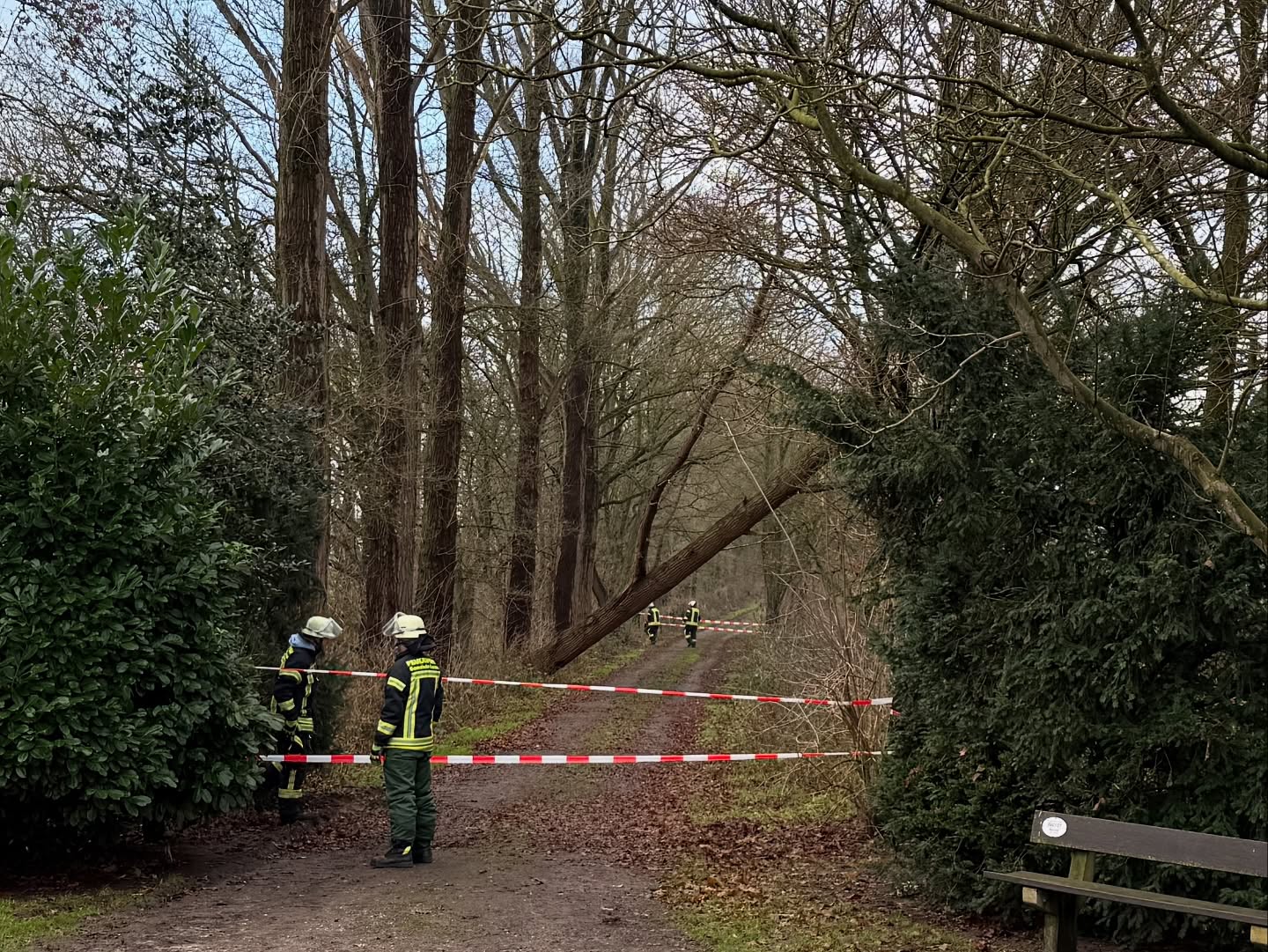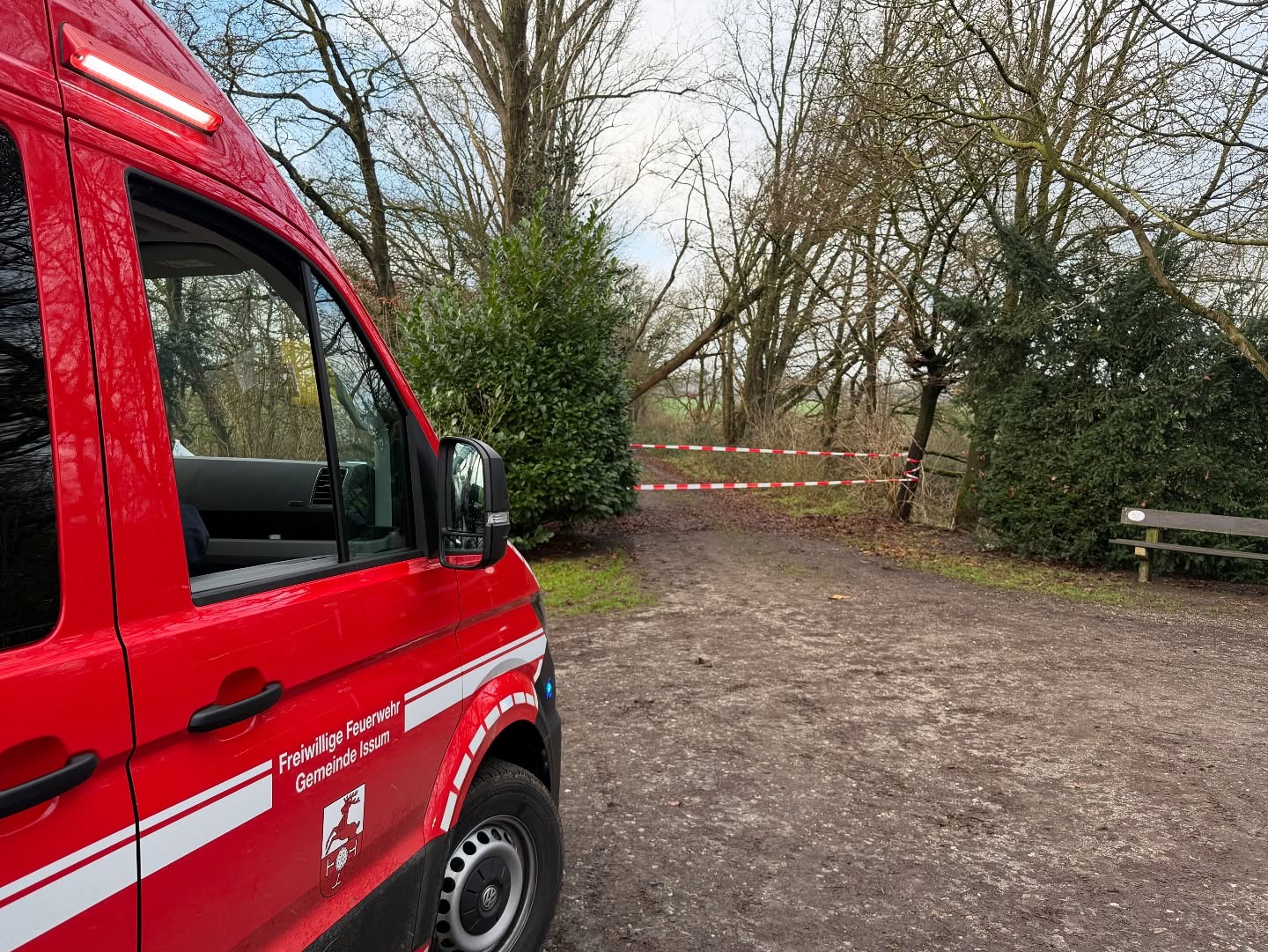 Eine umgewehte Pappel versperre einen Wanderweg am Kemper Steg. Da sich die Krone in einen anderen Baum aufhängte, sperrten die Einsatzkräfte der Feuerwehr den Wanderweg ab und übergaben die Einsatzstelle den Kollegen vom Bauhof, die unter Zuhilfenahme einer Hubarbeitsbühne die Gefahrenstelle beseitigen.