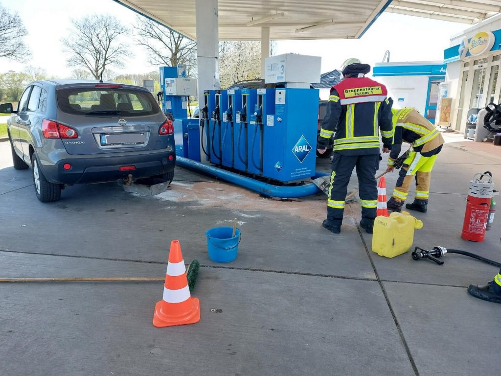 Ein Pkw hatte beim Tankvorgang Kraftstoff verloren. Die Einsatzkräfte der Feuerwehr stellen den Brandschutz sicher und sperrten die Tankstelle an der Weseler Straße für den Verkehr ab. Das ausgelaufene Benzin wurde mit Bindemittel abgestreut und zur fachgerechten Entsorgung wieder aufgenommen.