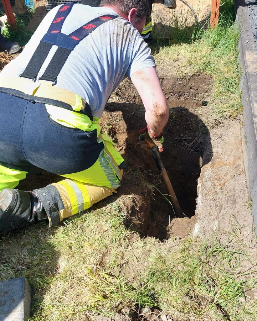 Mit einer Teleskopkamera wurde der Bau kontrolliert. Zusätzlich wurden mehrere Kopflöcher gegraben, um das Tier zu lokalisieren. Leider kam jede Hilfe zu spät – das Kaninchen konnte nur noch tot geborgen werden.