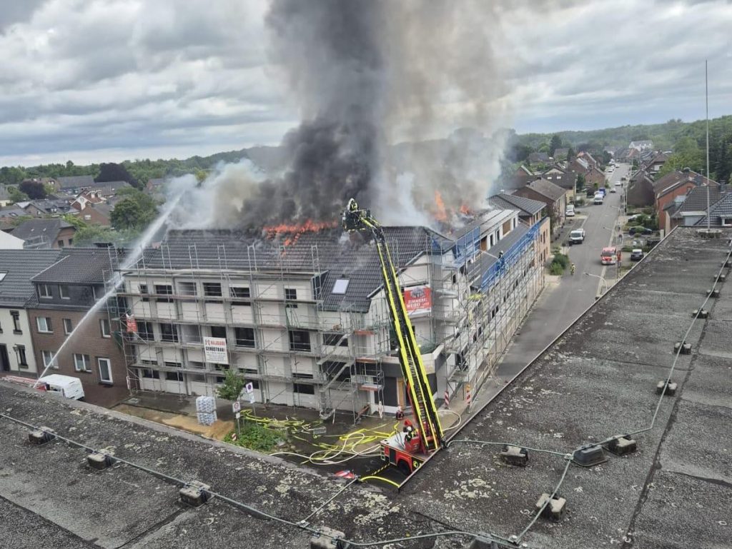 Am heutigen Tag kam es zu einem Vollbrand des Dachstuhls im ehemaligen Verwaltungsgebäude an der Brauerei-Diebels-Straße, das derzeit vom Bürogebäude zu Wohnraum umgebaut wird. Die Löschzüge Issum und Sevelen wurden zunächst alarmiert. Aufgrund der Lage vor Ort kamen zusätzlich die Drehleitern der Feuerwehren Geldern und Alpen zum Einsatz.